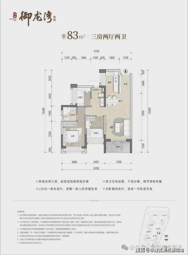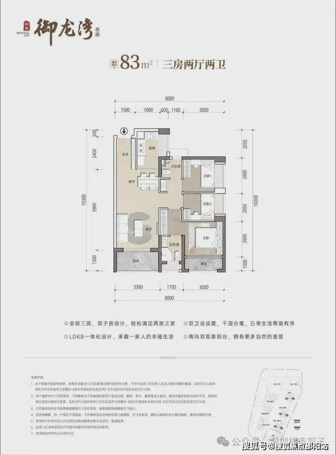 83㎡3房2卫,分布在2栋1/2单元02/05户型,设计的是竖厅格局,客厅开间3.3米,LDKB一体化设计,三开间朝南,U型厨房,公卫三段式分离设计!