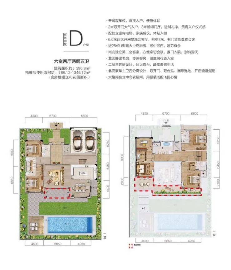六室两厅两厨五卫,建筑面积约396.8㎡,拓展后使用面积约786.12—1346.12㎡(含房屋赠送和花园面积)