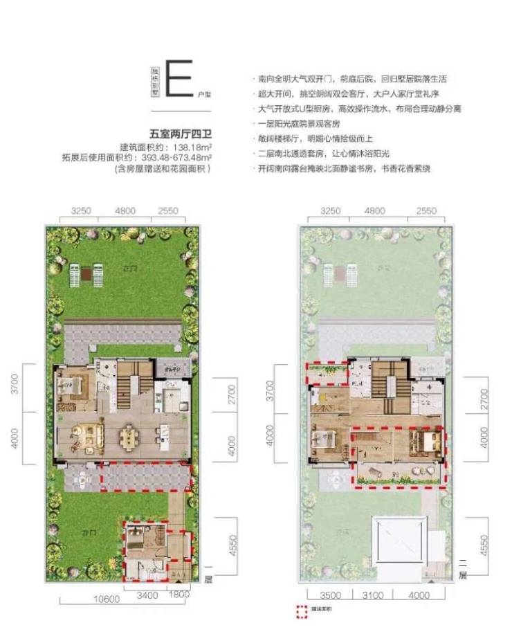 五室两厅四卫,建筑面积约138.18㎡,拓展后使用面积约393.48—688.48㎡(含房屋赠送和花园面积)