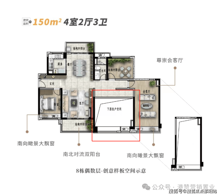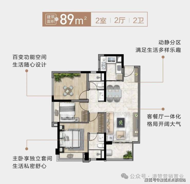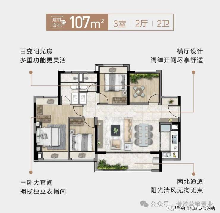 拥有南北通透双阳台,让居住空间更显大气。双主卧套间设计,采用南向全飘窗,细节之处彰显主人尊崇。超高的使用率,功能上回归家庭,布局上强调平衡,让空间更实用。