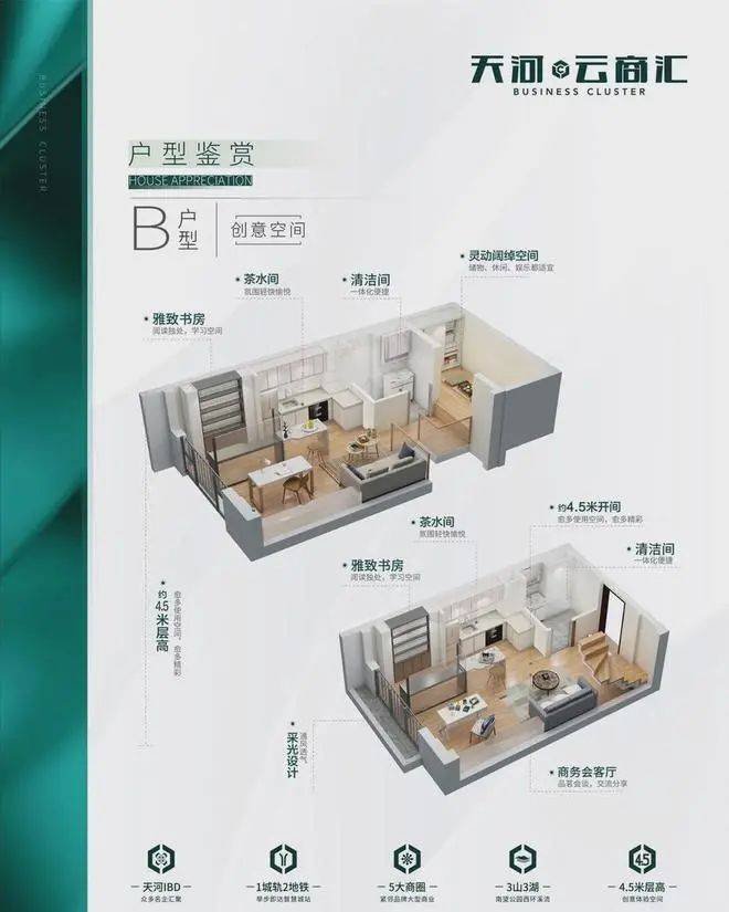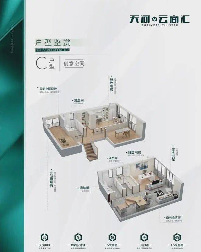 这里的最大亮点,则是精筑4.5米层高,建面约32-58㎡多功能创意空间。作为一个成熟的IT技术工程师,我打算一层作为休憩生活之地,另一层则用来进行IT工作,实现我羡慕多时的线上工作梦。不仅不用再跟别人一起挤地铁上班,还可随心所欲打造自己的工作室,简直是两全其美!