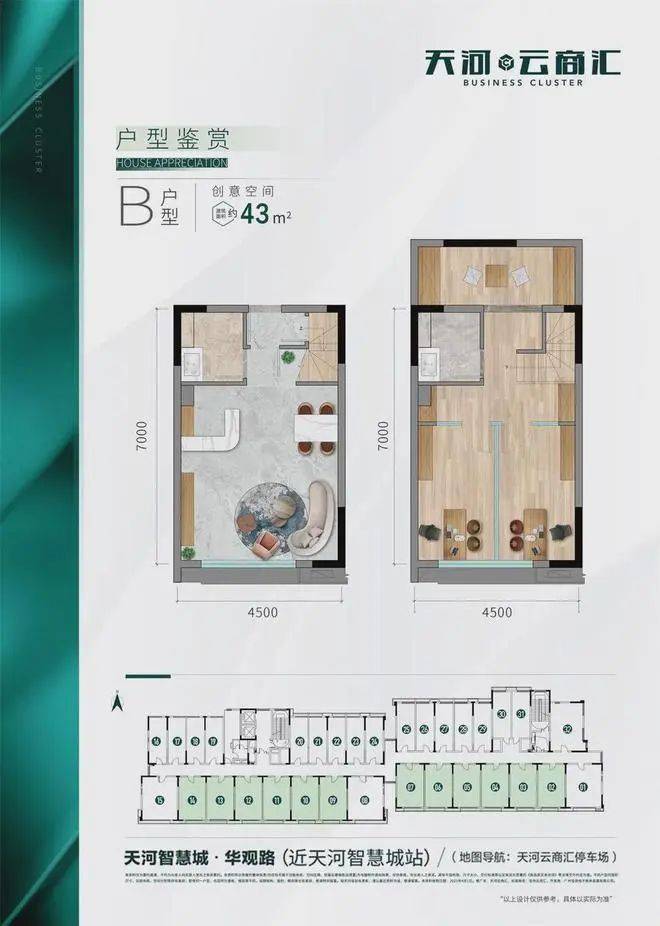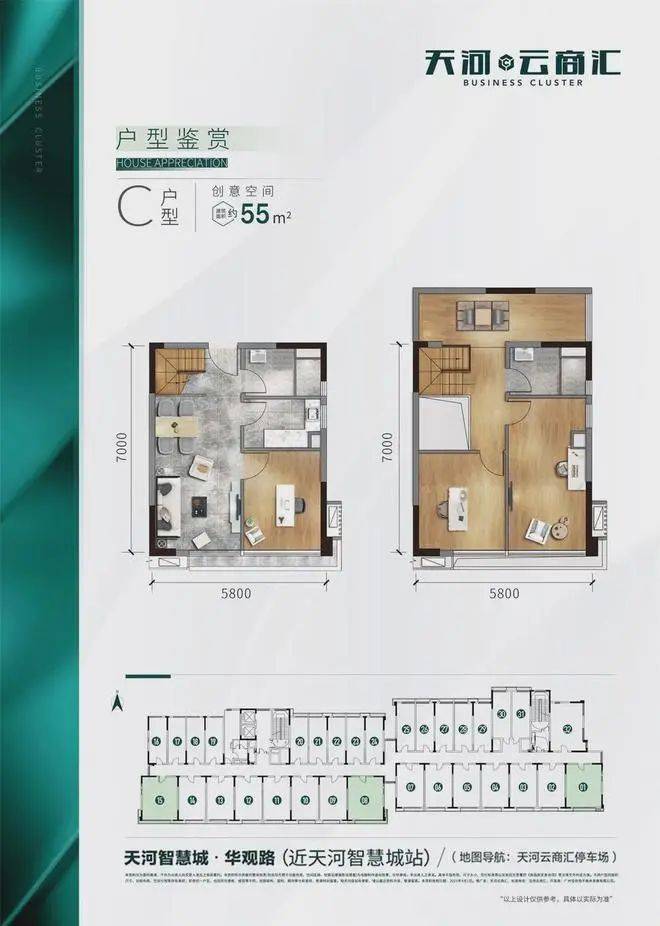 其中,创意LOFT建筑面积约30-55㎡,企业总部建筑面积约155-900㎡,总套数约1700套。