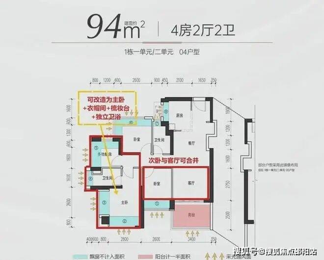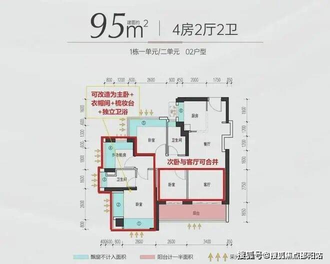 『建面约94/95㎡4房2厅2卫』