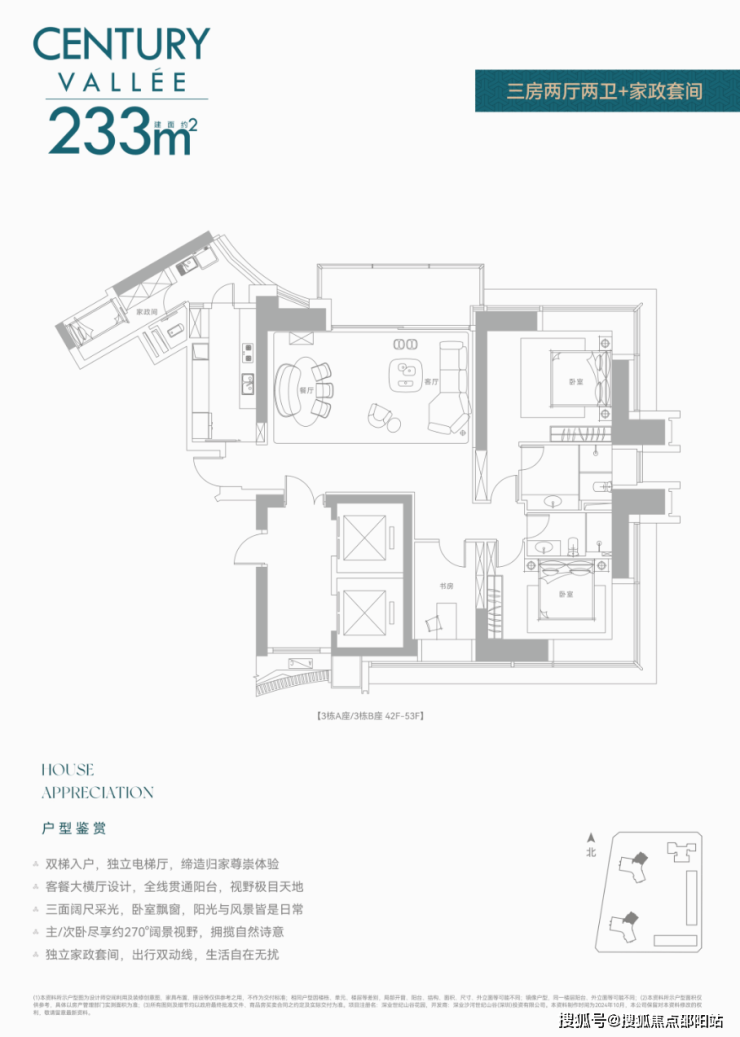 约233㎡3+1房3卫 A户型,西北朝向看名商和沙河高尔夫;