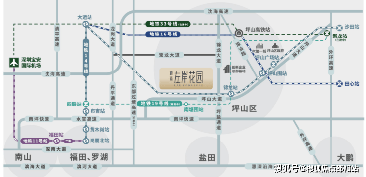 地铁14号线深圳东部首条地铁快线, 4站大运、12站福田岗厦北。地铁16号线深圳东部组团线路,快速联通龙岗、坪山。