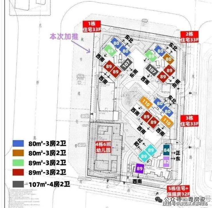 总占地面积约1.43万㎡,总建筑面积约11.49万㎡,计容建筑面积约7.91万㎡,容积率5.4,绿化率35.1%,共由4栋总高32-33F住宅组成,其中1/2/3栋商品房33F,5栋商品房+保障房32F,4栋是1所6班制幼儿园。