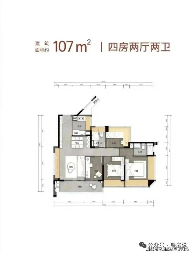 107㎡的4房2厅2卫,设计的是经典竖厅格局,客厅4米开间,LDKB一体化,S墙设计预留冰箱卡槽位,动静分区,分别做到了主卧17.18㎡/次卧11.2㎡/次卧8.64m²/次卧7.68㎡(包含墙体飘窗),U型厨房,卫生间干湿分离,得房率约79.6%(不含赠送),客厅连接次卧出10.24m²观景大阳台,东南朝向。套内面积85.19m²+赠送面积22.96m²=实用面积108.15m²,加上赠送面积后得房率101.08%。