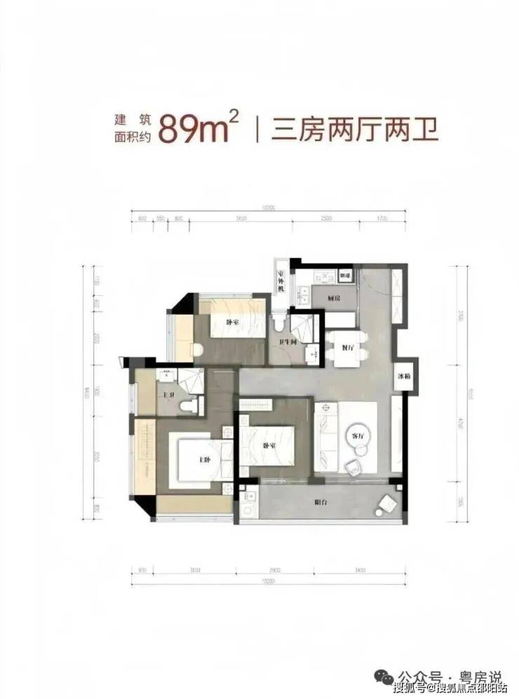 89㎡的3房2厅2卫,1栋04户型,设计的是横厅南北通透格局,客餐厅5.4米开间,LDKB一体化设计,分别做到了主卧16.02㎡/次卧9.07m²/次卧8.26㎡(包含墙体飘窗),客厅连接次卧出9.3m²的巨幕大阳台,L型厨房,卫生间干湿分离,得房率约79.6%(不含赠送),阳台主朝西南向。套内面积70.43m²+赠送面积21.17m²=实用面积91.6m²,加上赠送面积后得房率103.55%。
