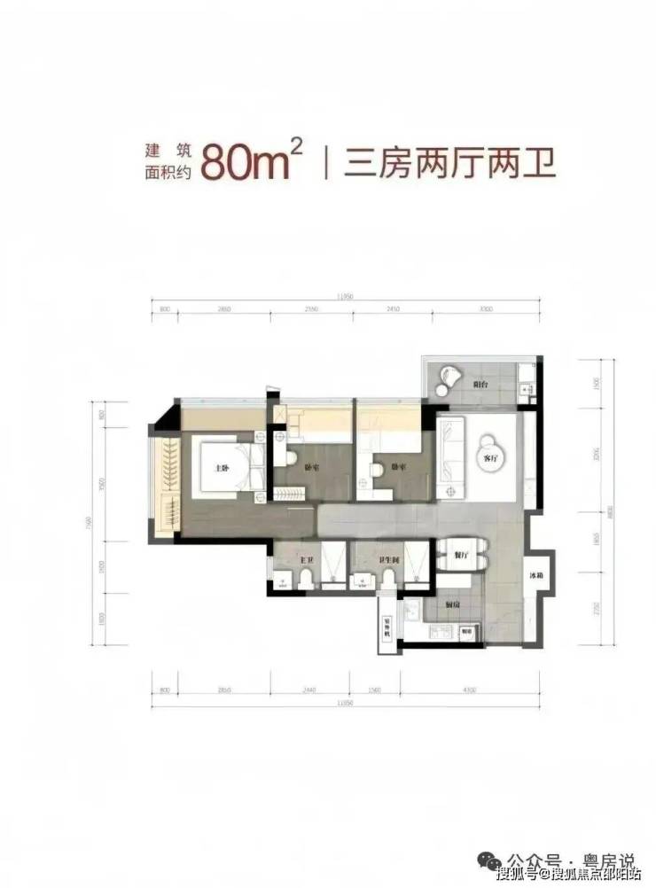 80㎡的3房2厅2卫,设计的是竖厅格局,客厅3.3米开间,LDKB一体化,S墙设计预留冰箱卡槽位,动静分区,分别做到了主卧16.38㎡/次卧8.16㎡/次卧7.84㎡(包含墙体飘窗),U型厨房,卫生间干湿分离,得房率约79.6%(不含赠送),阳台4.95m²东北朝向。套内面积63.98m²+赠送面积11.55m²=实用面积75.53m²,加上赠送面积后得房率94%。