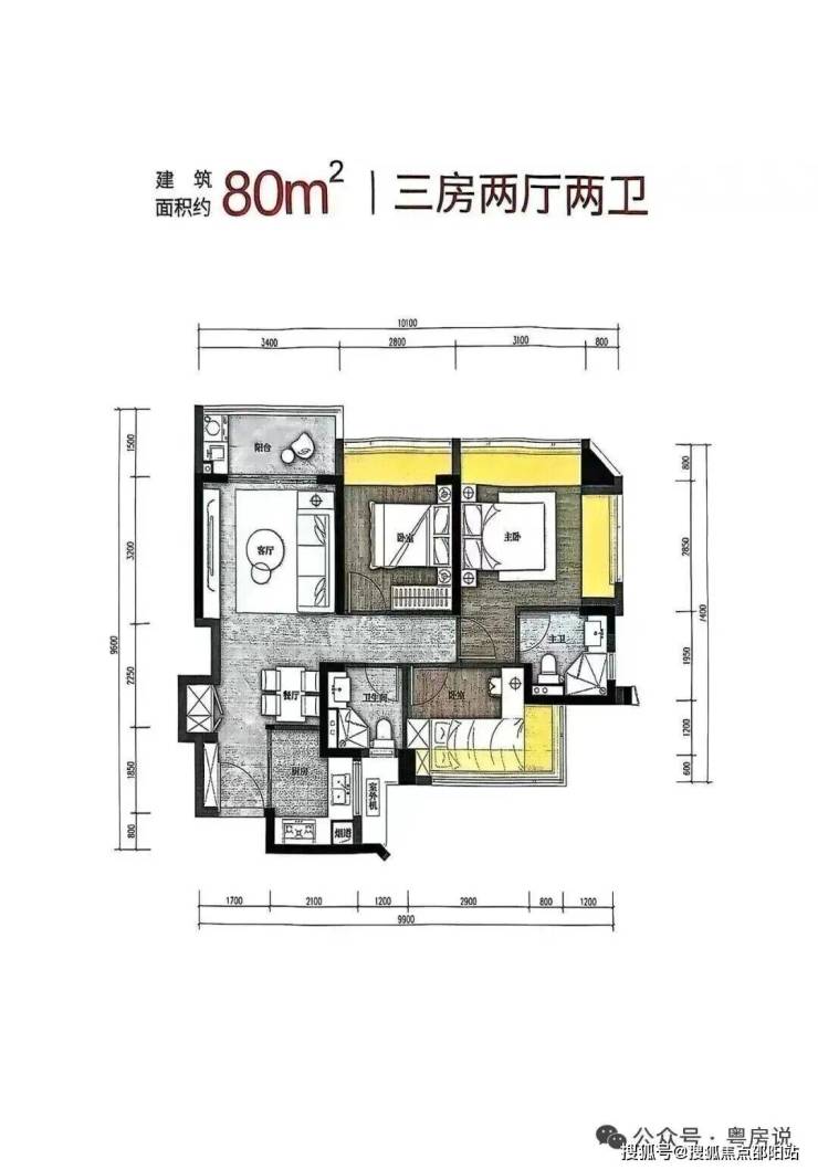 80㎡的3房2厅2卫(新增户型),设计的是竖厅格局,客厅3.4米开间,LDKB一体化,S墙设计预留冰箱卡槽位,动静分区,U型厨房,卫生间干湿分离,得房率约79.6%(不含赠送),阳台4东北朝向。