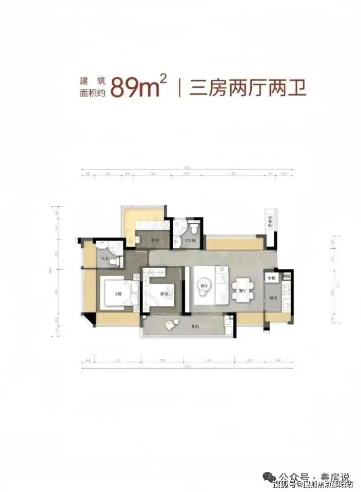 89㎡的3房2厅2卫,1栋02.03户型,设计的是经典竖厅格局,客厅3.4米开间,LDKB一体化,S墙设计预留冰箱卡槽位,动静分区,分别做到了主卧16.28㎡/次卧9.53㎡/次卧9.42㎡(包含墙体飘窗),U型厨房,卫生间干湿分离,得房率约79.6%(不含赠送),客厅连接次卧出9.45m²观景大阳台,西南朝向。套内面积70.43m²+赠送面积14.58m²=实用面积85.01m²,加上赠送面积后得房率96.1%。