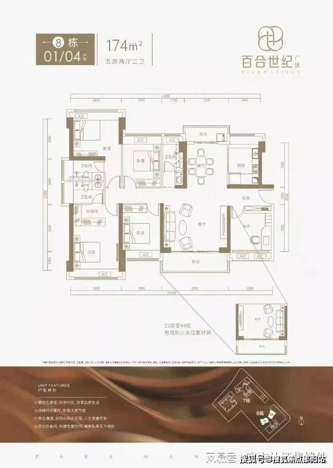 8栋174㎡的5房2厅3卫,设计的是竖厅南北通透格局,双阳台设计,客厅5米开间,5个卧室分别做到了3.8米/3.8米/3.3米/3米/3米的宽度,其中靓点是双主卧套房设计,U型厨房,公卫三段式分离设计,全屋飘窗设计。