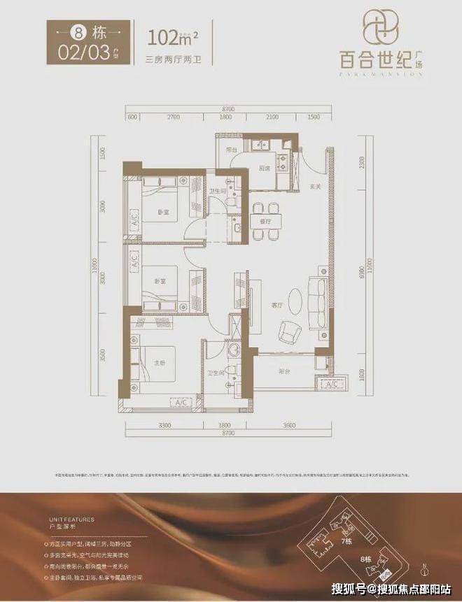8栋102㎡的3房2厅2卫,设计的是竖厅格局,餐客厅一体化,客厅3.6米开间,3个卧室宽度分别为3.3/3/3米,阳台1.6米进深,L型厨房,有带1个小生活阳台,都是东南朝向。