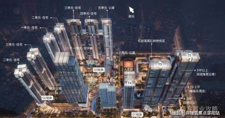 项目总建面达67.4万平方米,业态丰富多元,涵盖写字楼、公寓、住宅、酒店、购物中心,以及一所九年制公办学校和一所幼儿园,自成一座繁华大城。项目由四个地块组成,分两期开发:一期拆除范围用地面积约9.62万平方米,二期拆除范围用地面积2.27万平方米,预计首推03地块住宅,共6栋楼,其中4栋为大户型(含公寓)。