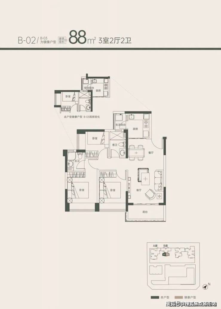 南北通透四房户型,是「京地海樾府」最大的户型,主阳台朝西北,生活阳台朝东南。同样位于1B座的2梯4户结构,这个户型只有58套,适合改善需求和周