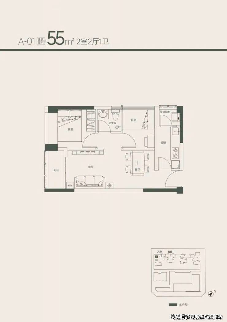 相较于55㎡户型这个两房的亮点在于厨房是真的太爽,还能设计推门整个空间看起来会比55㎡的两房大,东南向朝向也更优质。
