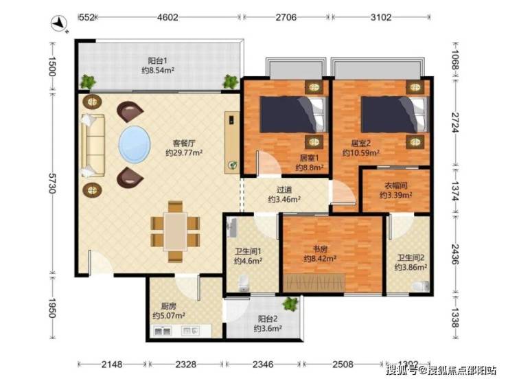 户型:3房2卫(可改4房)