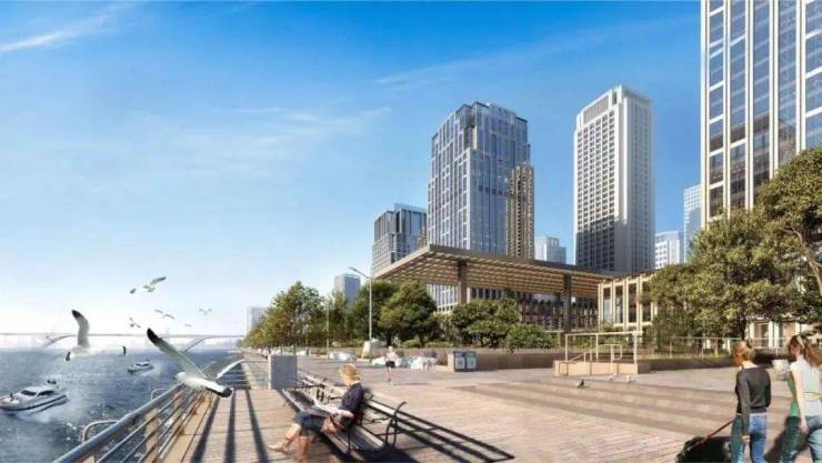 建筑采用中轴首排设计,实现了 “户户望江”。社区内部设置地下车行系统,做到人车分流,保证居住环境的静谧。