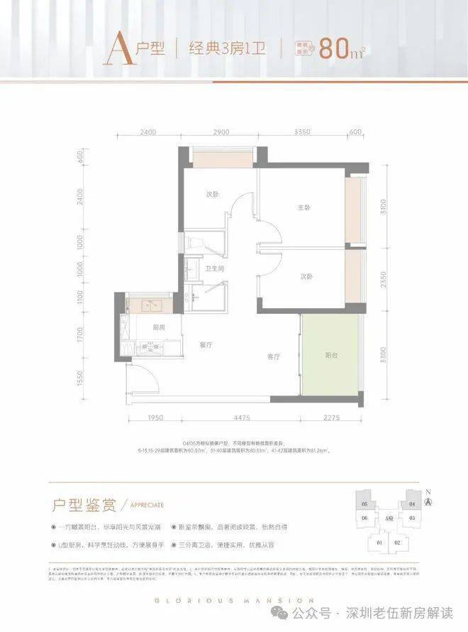 80㎡的3房2厅1卫,1栋A座04.05户型,设计的是竖厅格局,LDKB一体化,动静分区,次卧双飘窗设计,U型厨房,创新式三分离卫生间,得房率:74.24%(不含赠送),朝正西向或正东向。