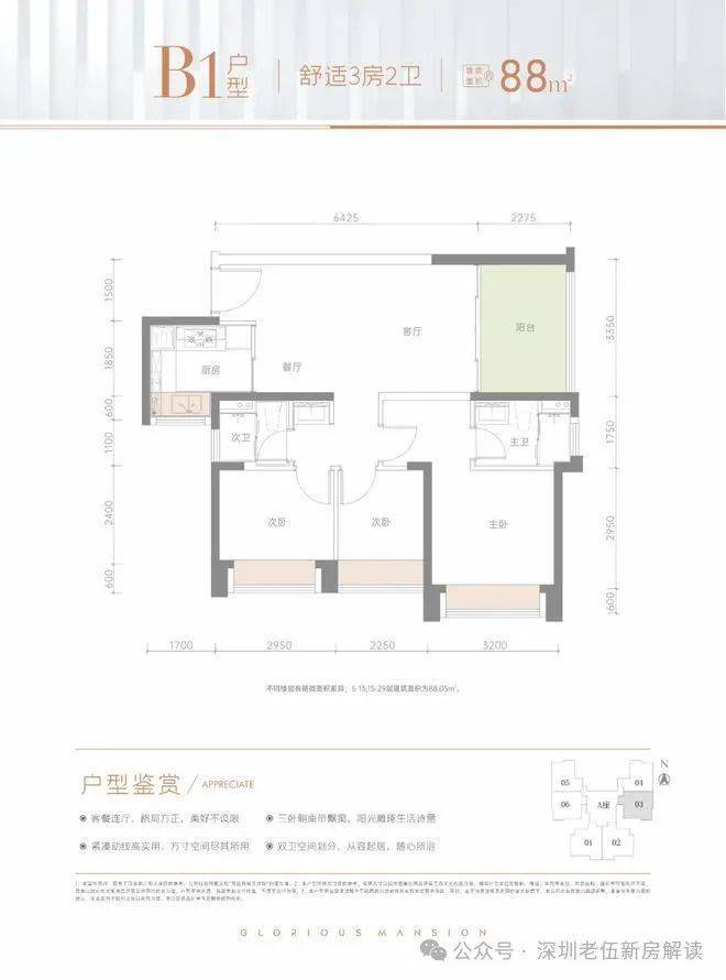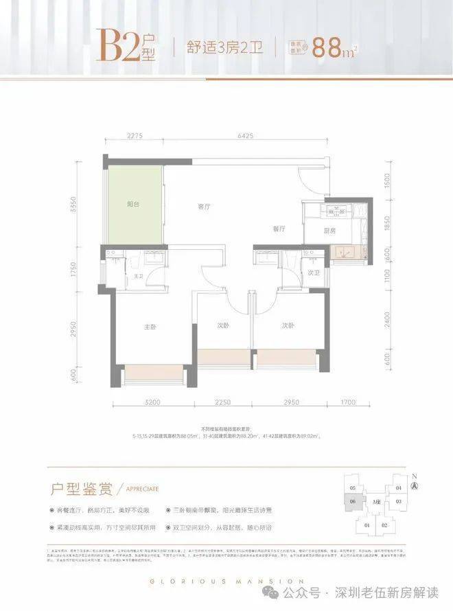 88㎡的3房2厅2卫,仅1栋A座06户型才有,设计的是竖厅格局,LDKB一体化,动静分区,三个卧室都朝南向,U型厨房,公卫三段式分离,得房率:74.12%(不含赠送),正东朝向。