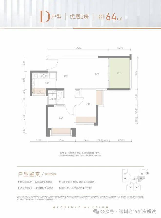 64㎡的2房2厅1卫,仅1栋A座03户型才有,设计的是竖厅格局,LDKB一体化,双卧室朝南向,次卧双飘窗设计,U型厨房,卫生间干湿分离,得房率:73.43%(不含赠送),朝正西向。