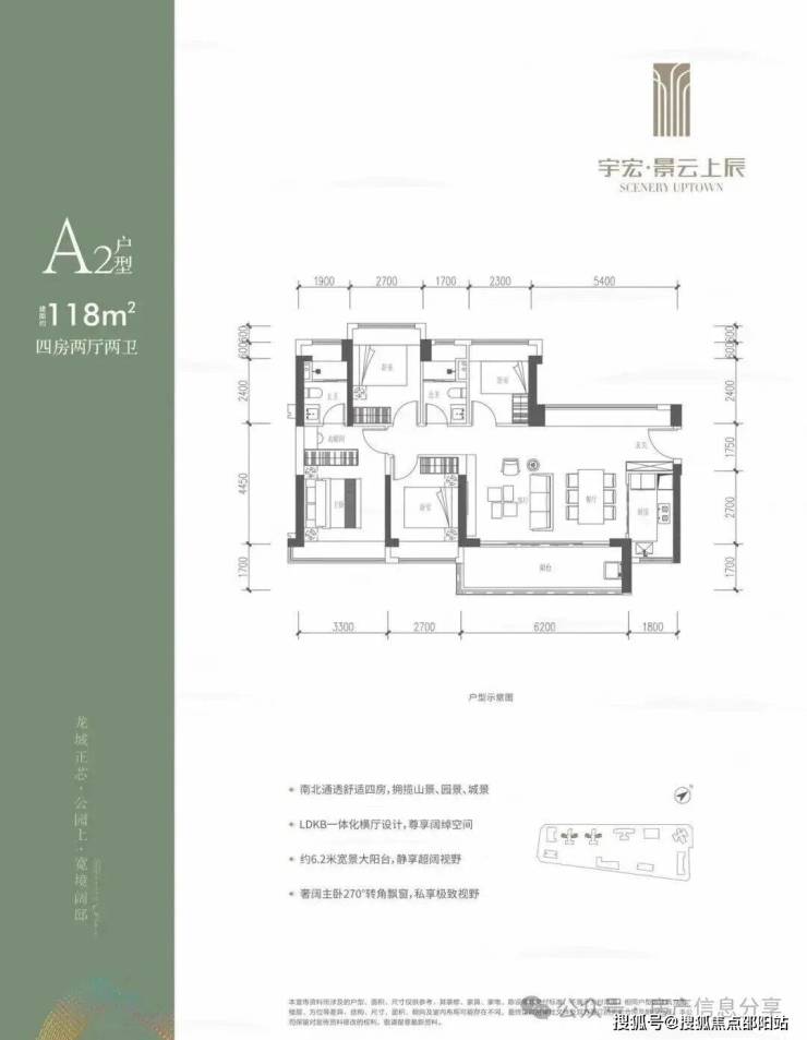 118㎡的4房2厅2卫,设计的是横厅南北通透格局,客餐厅6.2米开间,LDKB一体化,五开间朝南,西北面5.4米长的观景大飘窗,4个卧室分别做到了3.3米/2.7米/2.7米/2.3米的宽度,客厅连接餐厅位出6.2米长的大阳台,L型厨房,卫生间干湿分离,得房率约76%(不含赠送),东南朝向。