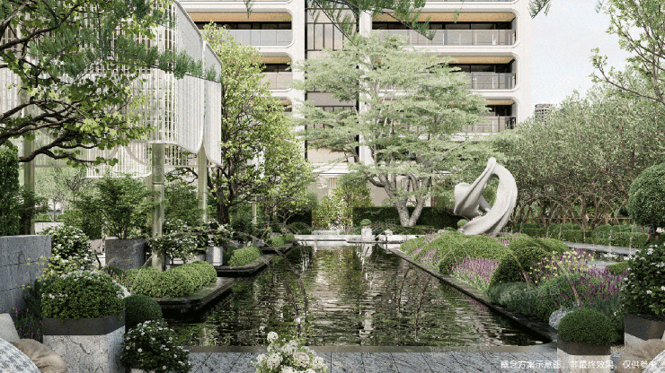 入口以对称柱廊与静水庭院构建庄重仪式感。柱廊挺拔,静水映天,归家第一步,从容而沉静。中心的下沉镜面水院,纳绿植、光影与建筑于一体,凝练为现代东方的水墨长卷,静谧中见深意。三层空中花园,以浮岛廊架、亲水乐园勾勒出全龄社交场。这里充满笑语与生机,是家庭休闲与邻里互动的理想之境。