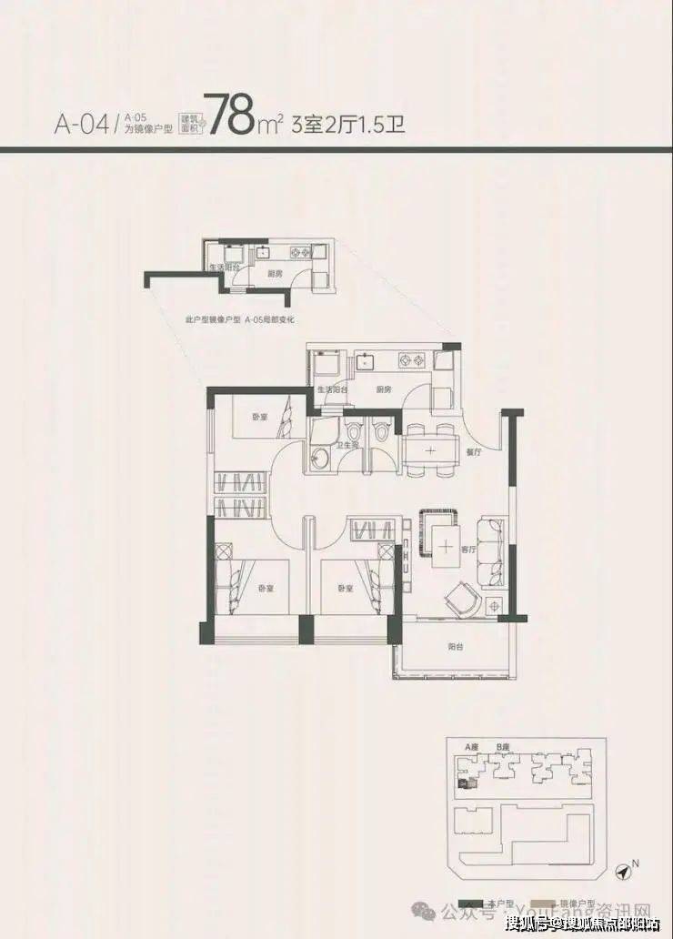 项目建面约78㎡的户型,配备1.5卫、双阳台,是市面上少有的极致三房。