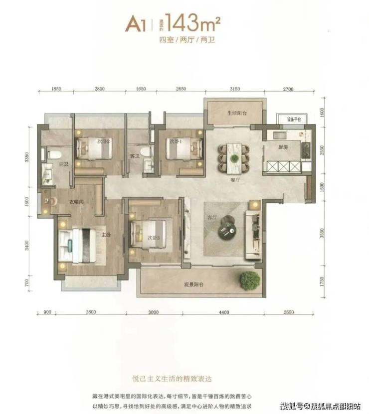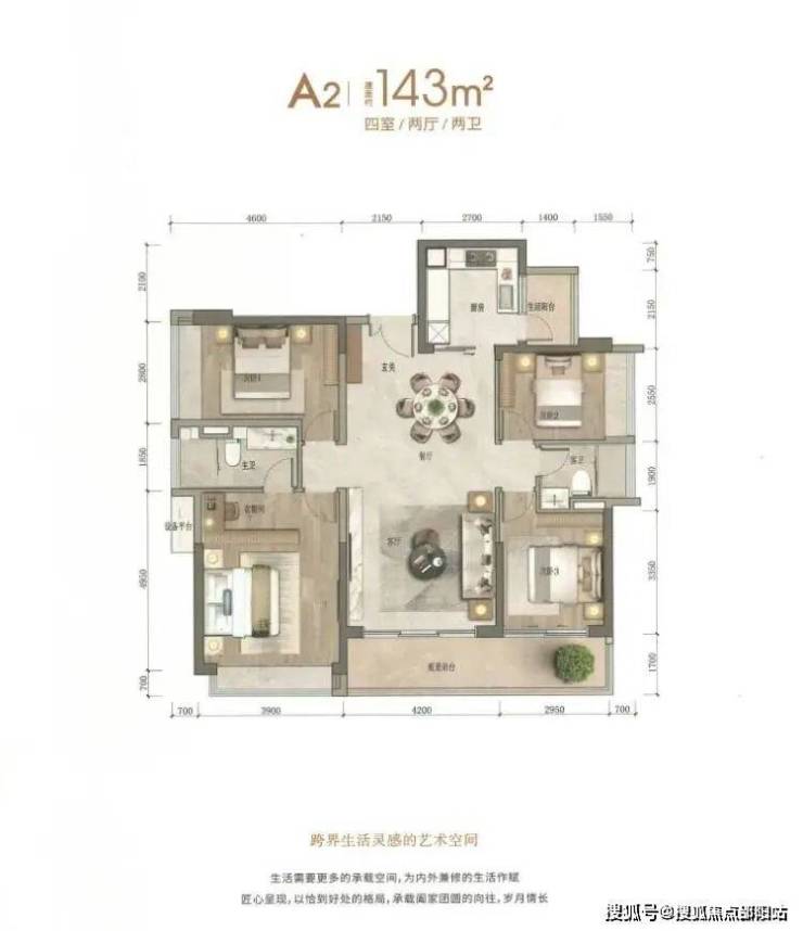 143平A2户型为四叶草竖厅结构,景观阳台跨度更宽,宽约7.1米,跨越客厅及次卧。
