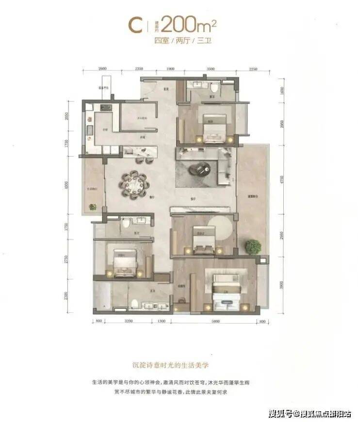 约208平户型是项目内最大的户型,为展翼式布局,卧室围绕起居室两侧垂直分布。