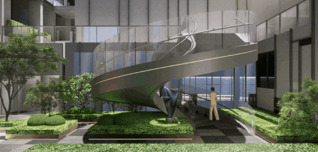 园林方面采用立体化设计,一楼打造会所、花园,二楼主题架空层打造空中花园、会客厅、健身区、艺术书吧、儿童区等。