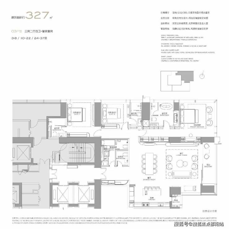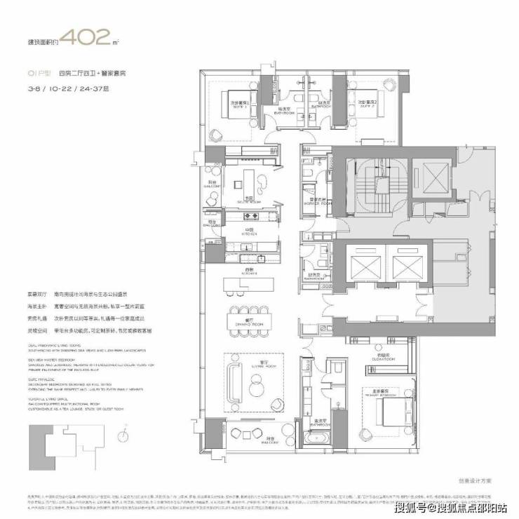GCC联泰超总湾位于深圳湾超级总部基地(深超总)核心区位,是深超总片区为数不多的居住用地项目。项目总占地面积约9.2万㎡,计容建筑面积约27.7万㎡,容积率低至3.0。项目规划4栋51至63层超高层公寓(含388米主塔楼T1),2栋高层办公楼,19套独栋董事公馆,16套合院别墅,以及约1.4万㎡高端定制商业。项目首推T3栋125套建面约303-1032㎡公寓,主力户型为304㎡、327㎡、402㎡大平层产品。