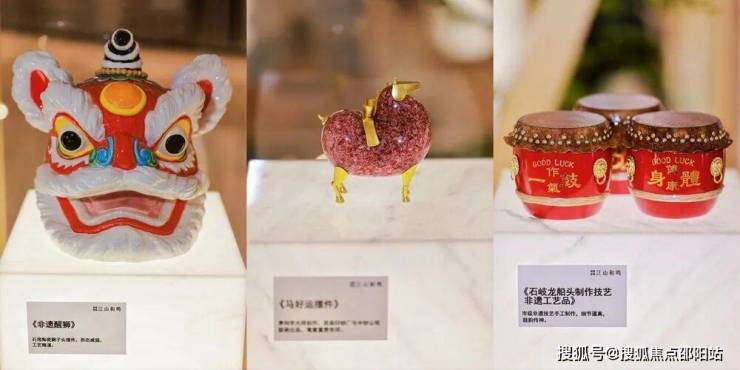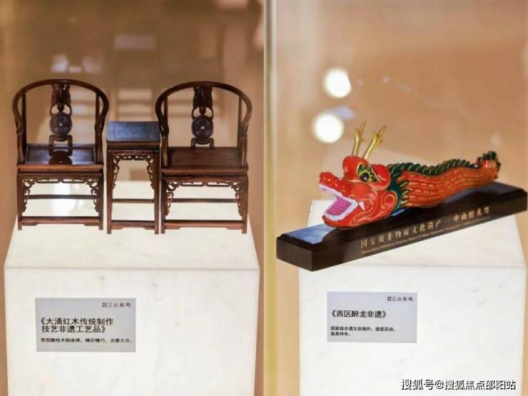 展厅系统呈现了 江山和鸣项目的 核心产品价值,同时创新性地引入中山本土非遗文化展示,展出具有中山地域特色的 大涌红木、长洲醉龙、石岐鼓艺、粤绣等非遗作品,旨在从人居与人文双重维度,展示城市发展的新形象、新标杆。