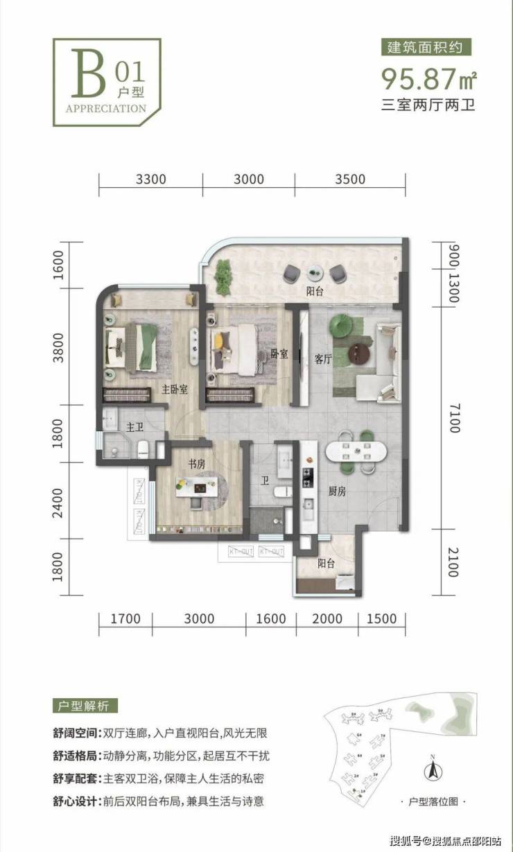 建筑面积约69-104㎡一至三房,方正开阔空间,户户阳台,动静分离,功能分区,厨房、阳台等多功能配套,全能居家,旅居休憩或家庭度假皆可。