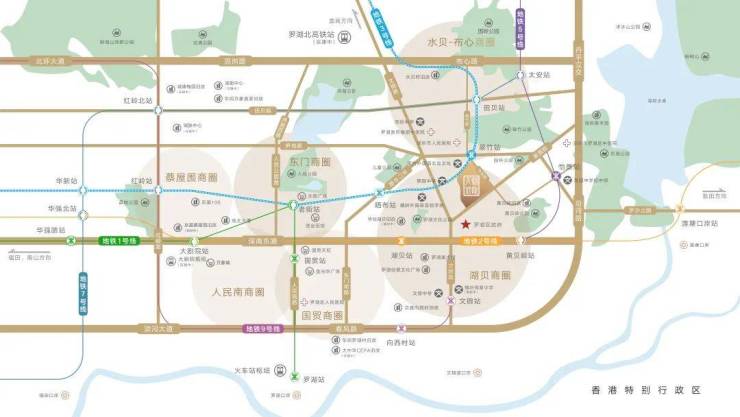 项目位于爱国路与华丽路交汇处,紧邻罗湖区行政中心,双地铁物业(3号线/24号线(规划中)翠竹站,25号线(规划中)木头龙站),6地铁环绕(1、2、3、5、24号线(规划中)25号线(规划中))。