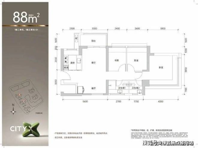 建面约88㎡三房两卫:对于追求高性价比的年轻家庭或二孩家庭而言,这款户型堪称“优选范本”。它做到了南北通透、户型方正,并罕见地实现了双卫设计,极大提升了居住便利性。特别是主卧的270°宽景采光,让阳光洒满生活的角落,温暖又明亮。