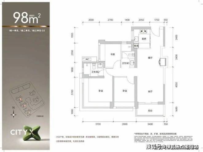 建面约98㎡三房两卫:这款户型更侧重于居住的舒适度与品质感。客餐厅及主要卧室多采用南向布局,确保了充足的采光与优良的通风。公卫巧妙地实现了干湿浴三分离,是对家人生活习惯的细致体贴。