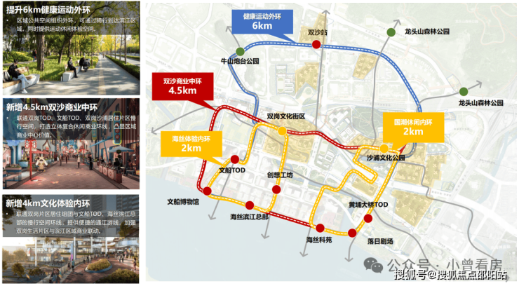 构建“两轴、一带、三廊、三环”的慢行系统网络,三环分别为6公里运动外环连接滨江,4.5公里商业中环连接华润万象系TOD商业,4公里文化体验内环连接各重要空间。
