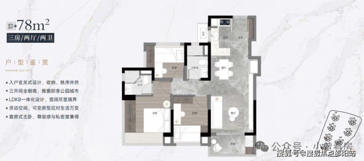 【78-79㎡三房二卫户型鉴赏】:板块最低总价南向三房二卫