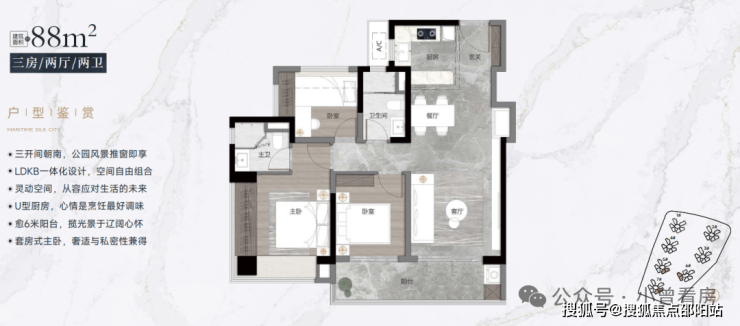 【88-90㎡三房二卫户型鉴赏】:约10㎡连体阳台,300-350万必看,相同总价比竞品多10个方