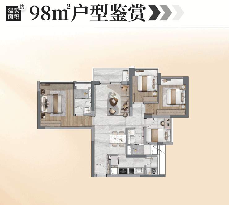 建面约98㎡四房,在区域内,首次将四房的门槛做到100㎡以内。
