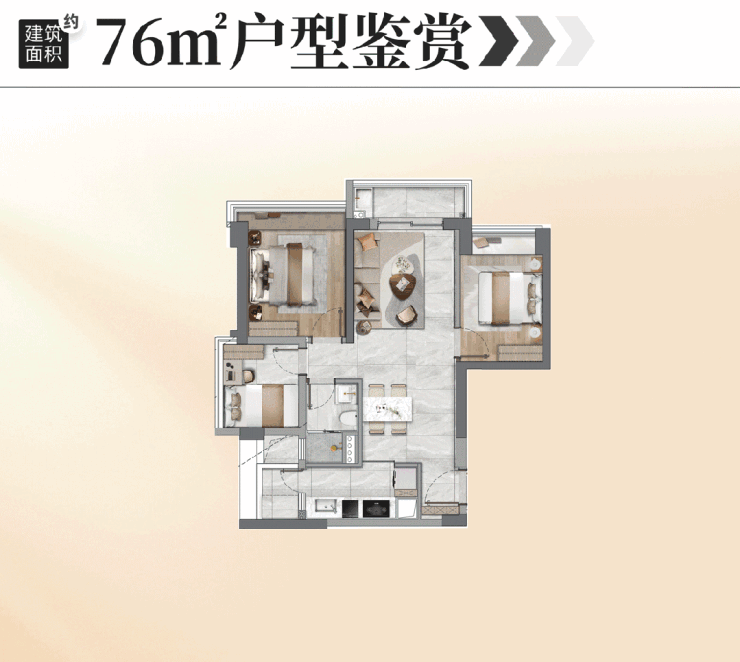建面约76㎡户型,在其它项目只能做两房或者逼仄的“1+2”房的面积段,不仅做到了真正实用、舒适的真·三房,更难得的是本次新品还在景观上全面升级,做到了江园双景!