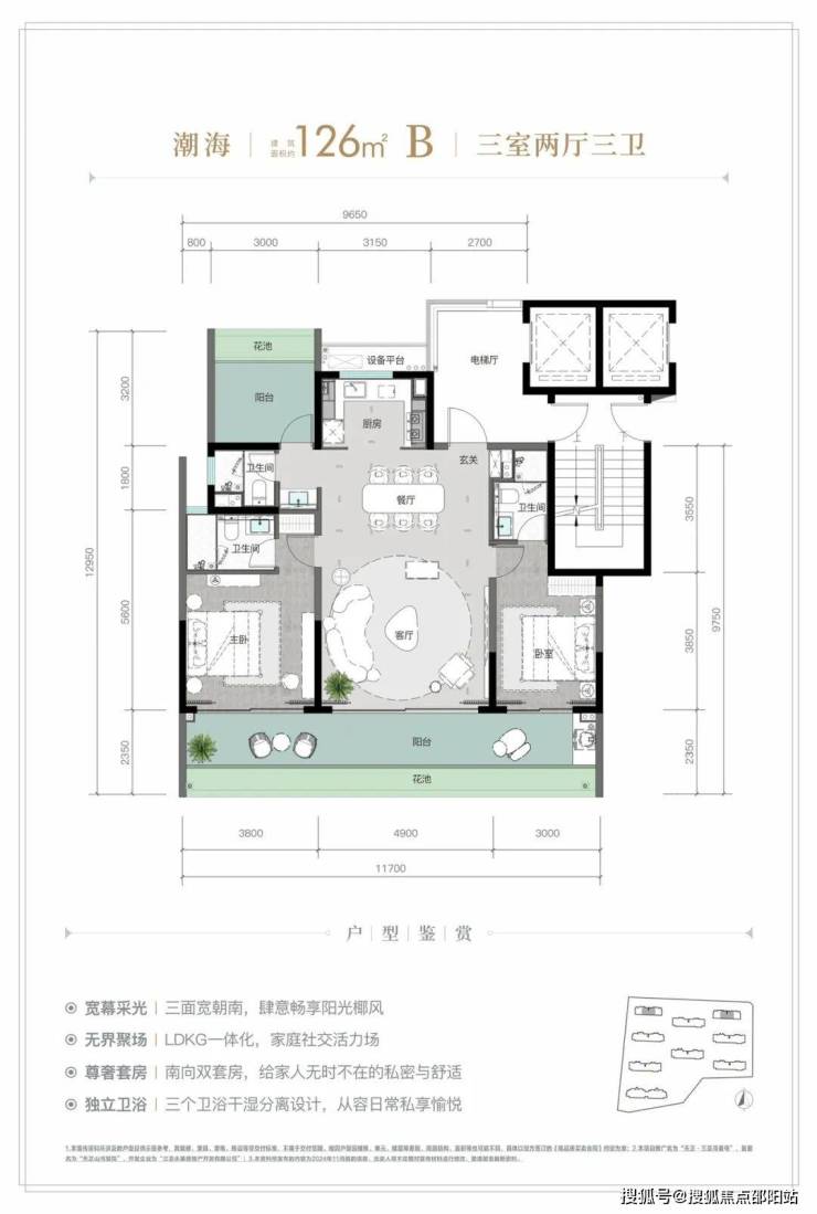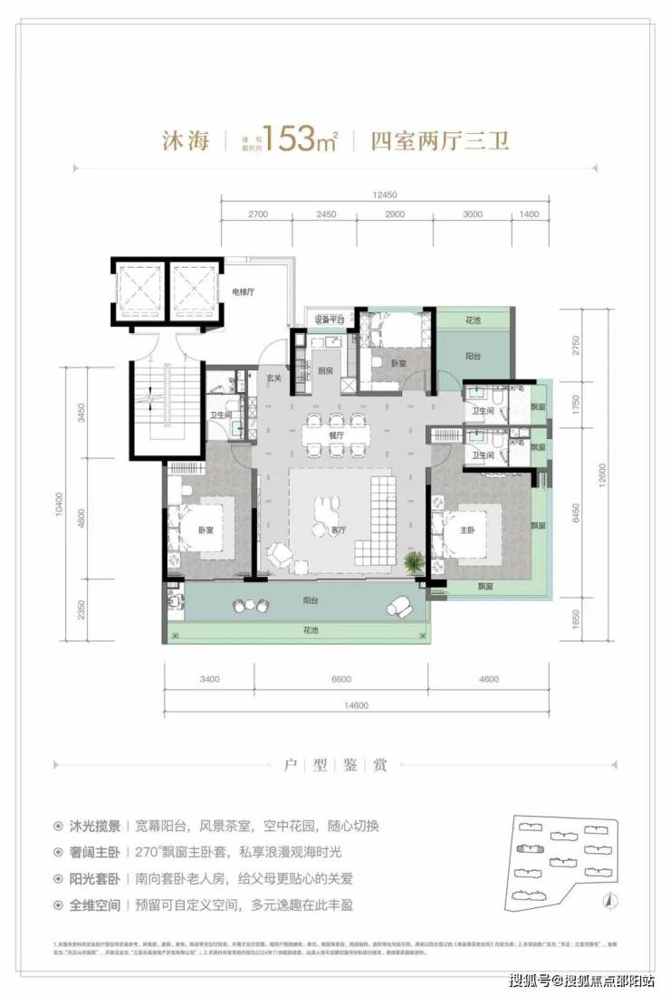 规划建筑面积约126-213㎡观海奢装大平层,约3.1米阔绰层高,部分户型创新设计270°全景飘窗主卧套、四开间朝南等,全成品高标奢装,营造全新舒居体验。