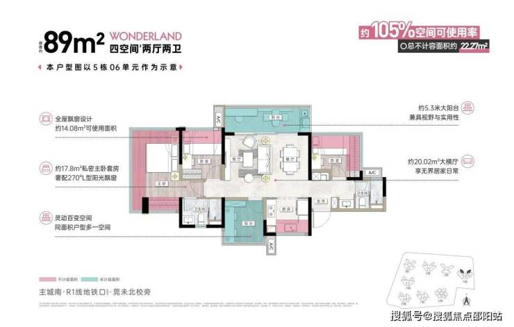 建面约89平,合计赠送面积约22.27平,实际空间使用率约105%。