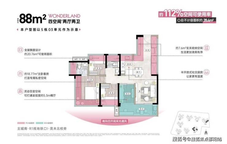 建面约88平,合计赠送面积约28.4平,实际空间使用率约112%。