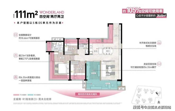 建面约111平,合计赠送面积约28.65平,实际空间使用率约105%。