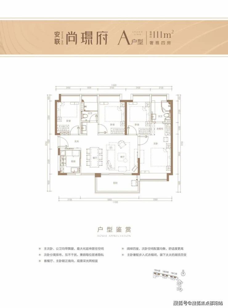 建面约111平4房,户型方正、大飘窗、全明户型、宽敞双卫设计,空间感好,功能性强,适合多人口家庭上车。