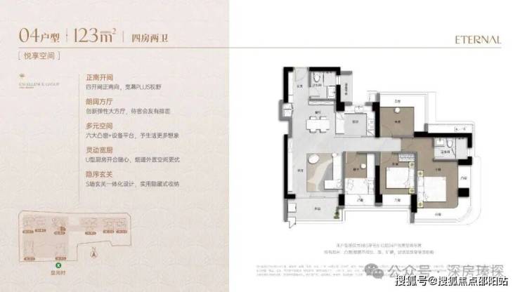 123m²的4房2厅2卫,设计的是经典竖厅格局,客厅4.2米开间,LDKB一体化弹性大方厅,S墙设计预留冰箱卡槽位,四开间朝南,动静分区,主卧套房270°环幕凸窗,六大凸窗+设备平台,分别做到了主卧20.36㎡/次卧10.14㎡/次卧10.04㎡/次卧8.14㎡(实测面积,去掉墙体),U型厨房,卫生间干湿分离,得房率76%(不含赠送,套内面积93.94㎡),正南朝向,看皇岗公园。