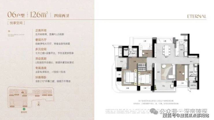 173m²的4房2厅3卫+家政间,设计的是竖厅类双龙抱珠格局,独立电梯厅入户约8.13㎡,客厅5.55米开间,LDKB一体化设计,主卧套房270°环幕凸窗+私享阳台,八大凸窗+设备平台+家政间,分别做到了主卧27.1㎡/次卧14.87㎡/次卧12.38㎡/次卧8.38㎡/家政间2.93㎡+阳台1.38㎡(实测面积,去掉墙体),U型厨房,公卫三段式干湿分离,得房率76%(不含赠送,套内面积131.98㎡),阳台9.56㎡正北朝向,看会展中心+市民广场。