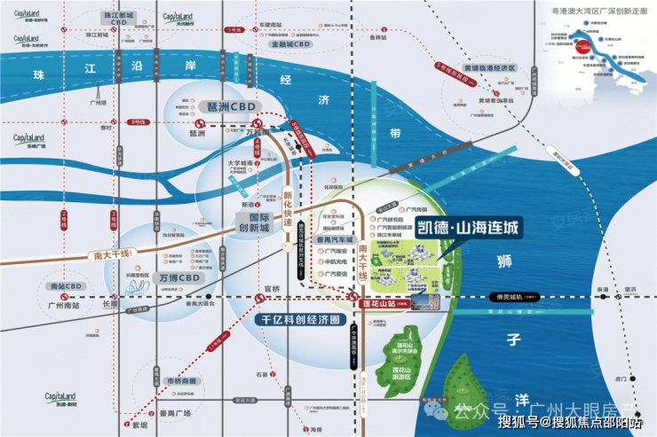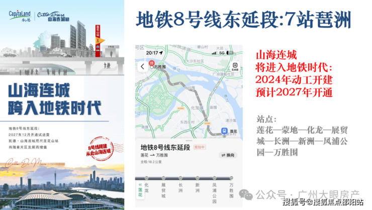 莲花湾板块,属于番禺东石楼镇,整体发展缓慢,配套不齐全,得益于南大干线的开通,缩短了到市区的距离,开车出行非常方便,比如到琶洲30分钟左右,还有规划地铁8号线东延段,但是也要3-4公里,跟17号线,还有两条城轨,一条高铁,打造所谓的五轨交汇的莲花湾TOD,不过都是需要时间兑现,哪怕建好都是不近现在在售的楼盘,也要2-3公里。